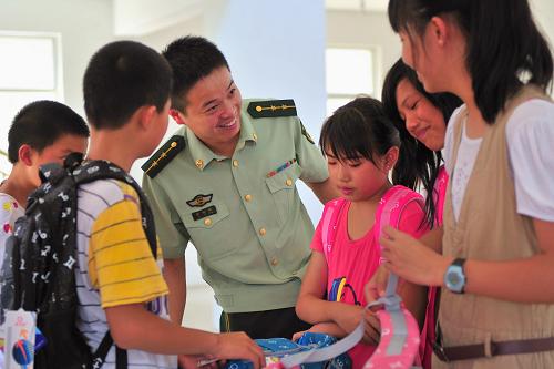 8月22日,福清边防大队官兵为即将开学的贫困学生送来书籍、文具盒和书包等学习用品。新华社记者 魏培全 摄