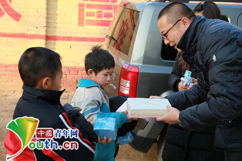 11月23日下午,北京朝阳区民盟的五名代表满载着盟员们捐助的冬衣和文具,将一百三十余件秋冬衣物和一千余元的文具送到了河北省肃宁县的贫困家庭的学生手里。中国青年网通讯员 吴元龙供图