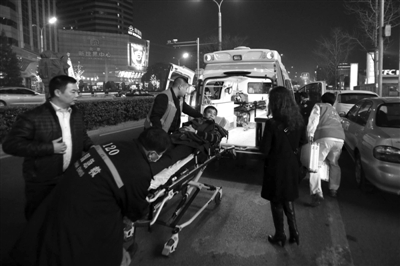 前晚,在国瑞城门口的非机动车道上,急救人员将一名病人推上120急救车。记者 王嘉宁 摄