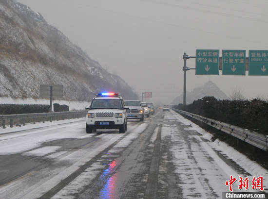 图为在太原绕城高速南环段,高速公安交警最大限度不封路,派出警力及警用车辆带道压速护送车辆通行。警方供图