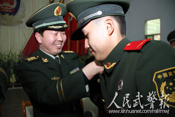 “在任何情况下,坚决服从命令,严守法纪,勇上一线,为维护国家安全和社会稳定、保障人民安居乐业,甘愿奉献一切!”铮铮誓言中饱含了新兵对党的绝对忠诚和履行光荣使命的坚定决心。“从现在起,我就是一名真正的武警战士了。我一定会牢记庄严承诺,坚定理想信念,用自己的青春、智慧和汗水书写军旅人生华美篇章。”刚刚戴上警衔的湖北籍新兵曾海龙自豪地说到。