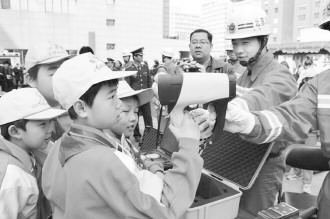 图为4月12日,消防战士为小学生们介绍“消防望远镜”中的模拟着火场景。