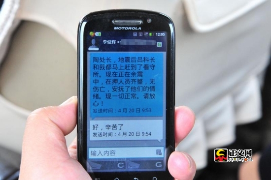 4月20日上午9点53分,雅安市检察院监所处处长陶旭辉收到天全县检察院监所科助理检察员李俊辉发来的短信。“地震后吕科长和我都马上赶到了天全县看守所。现在正在余震中,在押人员齐整,无伤亡,安抚了他们的情绪。现一切正常。请放心。”[详细]