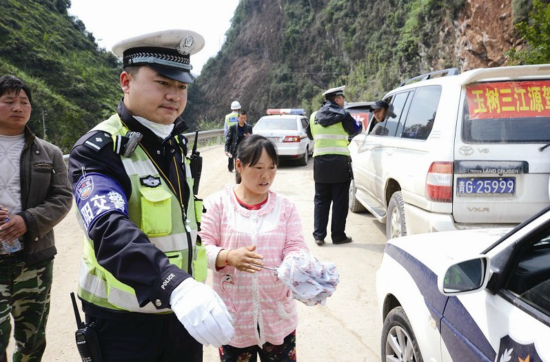 4月25日,驰援灾区的绵阳交警在路上巡查时,接到两名急需去医院检查的孕妇求助。交警们一面与沿线交警联系,开辟绿色通道,一面迅速驾车将两名孕妇安全送至芦山县人民医院。 杨 建 摄