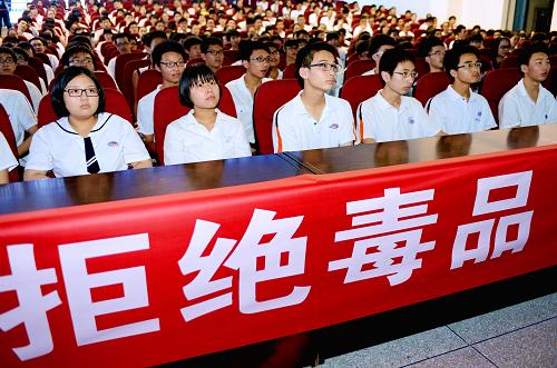 6月19日,福清一中学生在福清边检、公安禁毒大队联合举办的“禁毒知识讲座”上听讲。当日,福建省福清边防检查站、福清市公安局禁毒大队联合开展“禁毒宣传进校园”活动。让青少年充分了解毒品的种类、危害、识别方法,提高他们的识毒、防毒、拒毒能力。新华社记者 张国俊 摄
