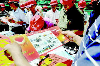 6月20日,在“6·26国际禁毒日”前夕,广东省公安边防总队中山边防支队开展了“禁毒宣传进工地”活动,边防官兵深入驻地工地为农民工宣讲有关毒品的知识,发放禁毒宣传资料,讲解毒品的种类及危害。活动中,边防官兵向驻地农民工发放了千余份禁毒宣传资料。随后,近百名农民工在横幅上签名承诺自觉拒绝毒品。李松林摄