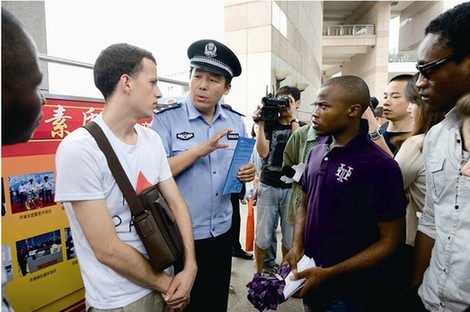 7月1日,《中华人民共和国出境入境管理法》正式施行。当日,山东省公安厅组织公安出入境和公安边防、边检部门举行《中华人民共和国出境入境管理法》集中宣传日活动。图为民警向外国留学生介绍“新法”。(记者 崔前程 摄)