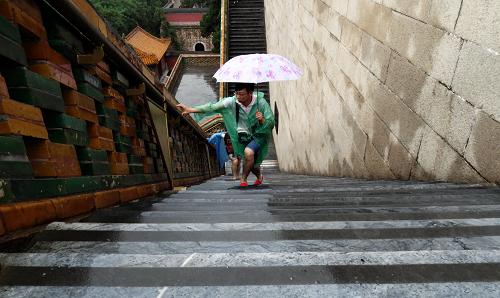7月9日,游客在雨中踏着贴有防滑条的石阶游览颐和园佛香阁。新华社记者 李欣 摄