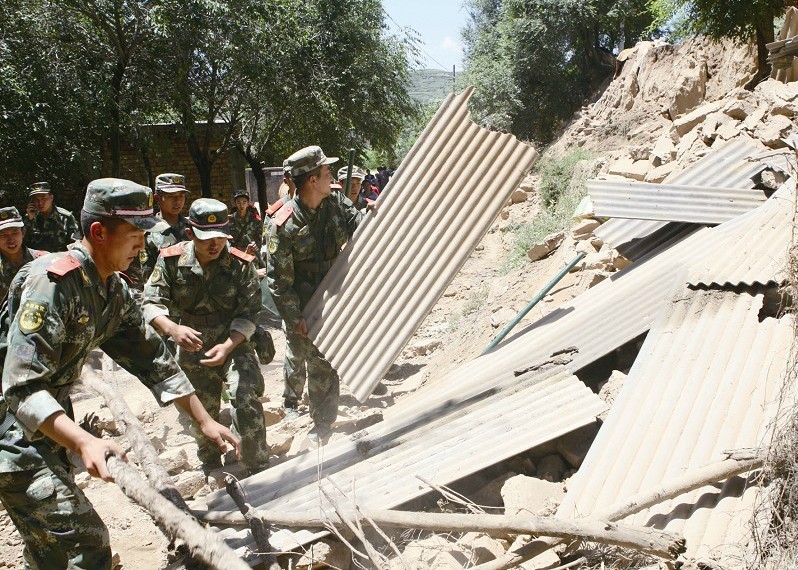 武警官兵在岷县梅川镇马家沟村开展救援。 屈杰文 摄