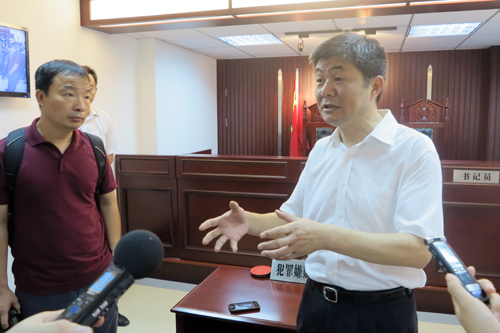 图为昆山市人民检察院检察长黄甫觉新向记者介绍公(直)诉办案工作区情况