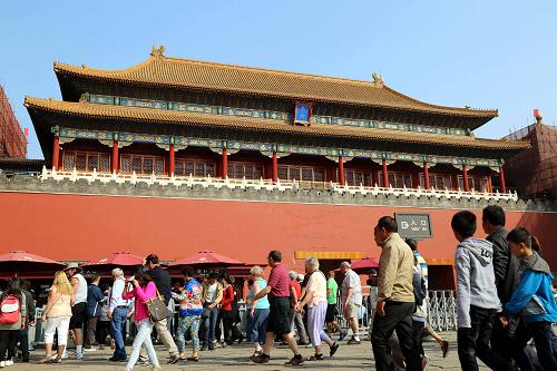 10月7日,游客前往北京故宫博物院参观游览。当日是国庆长假最后一天,持续雾霾的北京天气转好,北京各大旅游景点游览热度依然火爆。新华社发(王振 摄)