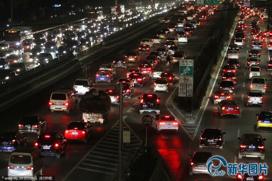 2013年10月12日,晚高峰时间,北京全城交通严重拥堵。晚高峰交通指数一度攀升至9.4,平均速度只有15.9公里/小时,城区各区域均交通拥堵指数全线飘红,路面处于严重拥堵状态。此次拥堵没有得到有效预报,分析是由于双休日不限行、工作日、节前聚会访友等多重因素引发“意外暴堵”。(资料图片来源:CFP)