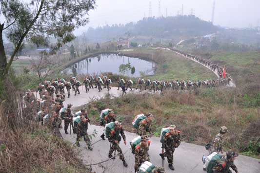 12月17日,武警三支队200余名新兵和新训干部骨干背着被褥,携带挂包、雨衣、水壶等整齐列队,随着指挥员一声“出发”命令,长达20余公里的野外拉练正式启动。此举是为了锻炼部队特别能吃苦,特别能战斗的精神,以便关键时候“拉得出,打得赢”,维护一方平安。