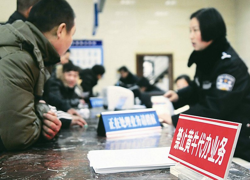 为让群众办理车管业务更加方便快捷,安徽省固镇县公安局交警大队依法简化办事流程,增设服务窗口,公开办事程序、收费标准,推行邮政快递业务,遏制“黄牛”扰民。图为1月7日,民警为群众办理新车注册登记。 吴献永 摄