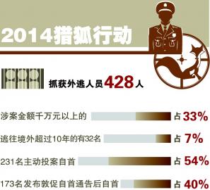 代号为“猎狐2014”的全国公安机关缉捕在逃境外经济犯罪嫌疑人专项行动开展以来,先后从60个国家和地区抓获外逃经济犯罪人员428名。
