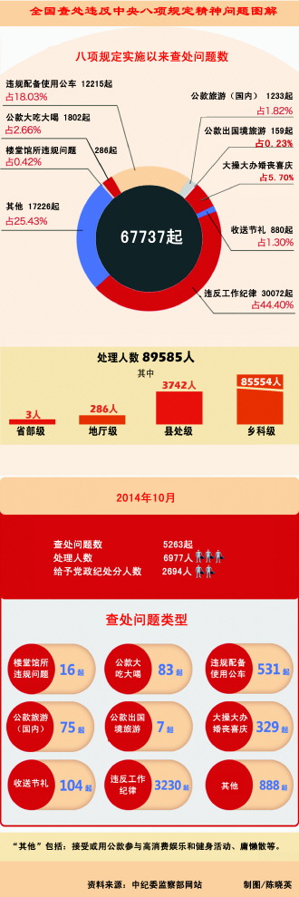 根据中纪委监察部网站公布的数据,自中央八项规定实施以来至今年10月31日,全国查处违反中央八项规定精神问题数达67737起,处理89585人,给予党政纪处分25975人。