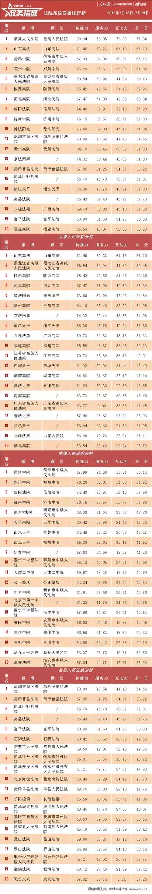 全国政法双微指数排行榜(7月13日--19日)