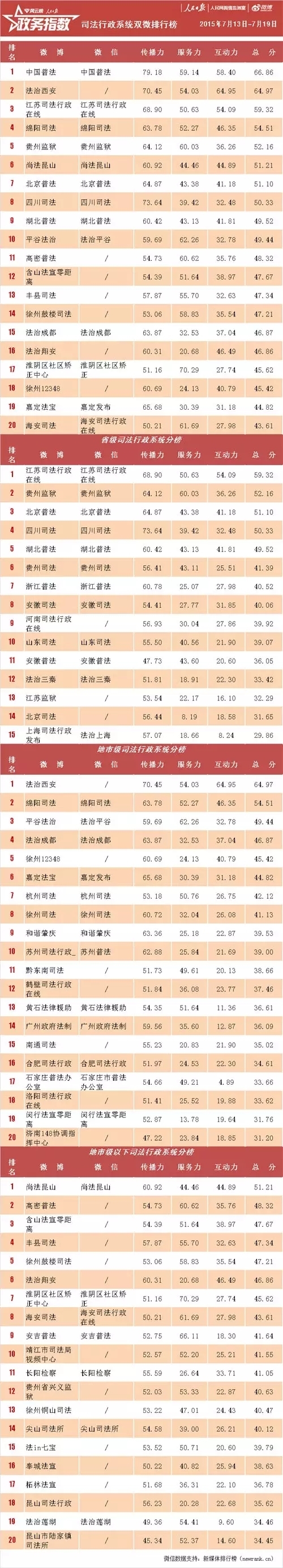 人民网舆情监测室发布新的一期全国政法系统“双微”排行榜周榜,榜单通过对新浪微博和微信两大平台中25000余个政法系统机构开设的微博、微信账号进行数据统计和分析,从传播力、服务力和互动力三个维度评估每个账号的运营情况,本榜单统计周期为7月13日至7月19日。
