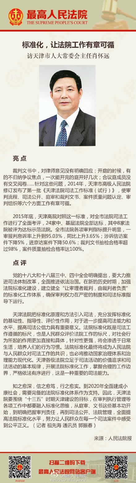 #高端点评#【肖怀远:标准化,让法院工作有章可循】党的十八大和十八届三中、四中全会明确提出,要大力推进司法体制改革,全面推进依法治国。在新的历史时期,加强法院标准化建设,建立健全“让审理者裁判,由裁判者负责”的标准化工作体系,确保审判权力在严密的制度和司法标准指导下运行。