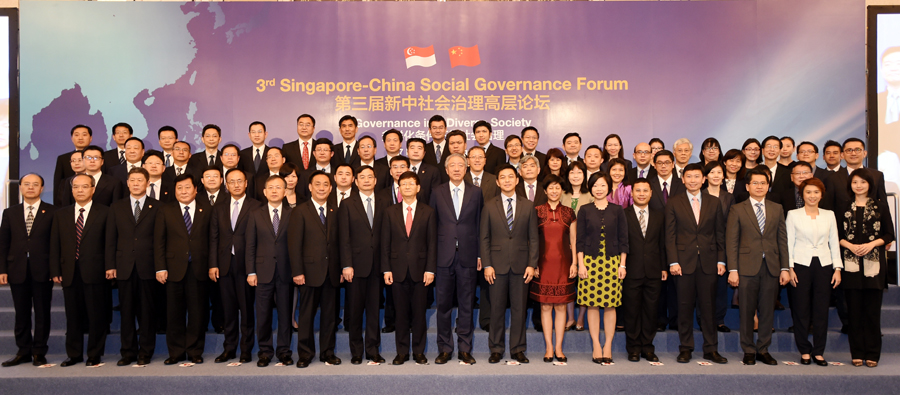 第三届中新社会治理高层论坛在新加坡举行,孟建柱出席并讲话。图为论坛开幕式前,孟建柱、张志贤与中新双方参加论坛的代表合影。郝帆 摄