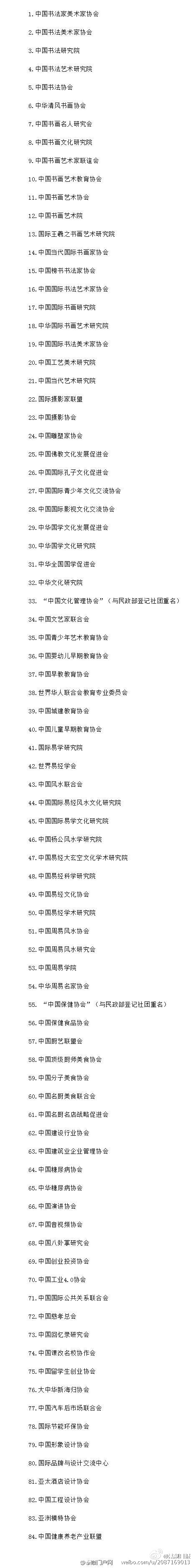 【民政部公布第八批“山寨社团”名单】20日,民政部公布了第八批共84家“离岸社团”“山寨社团”名单。其中包括中国书法家美术家协会、中国摄影协会、中国国际孔子文化促进会、中华国学文化发展促进会等。截至20日,民政部曝光的“离岸社团”“山寨社团”数量已达748家。网页链接