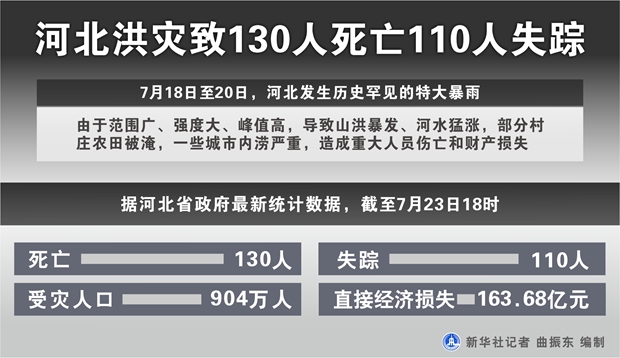 新华社石家庄7月24日电 据河北省政府最新统计数据,截至23日18时,河北洪水受灾人口达904万,因灾死亡130人、失踪110人,直接经济损失163.68亿元。