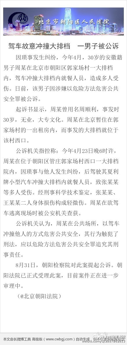 【北京男子驾车冲撞大排档 致多人受伤被公诉】据@北京朝阳法院 ,因琐事发生纠纷,今年4月,30岁的周某在北京市朝阳区郭家场村一大排档内,驾车冲撞大排档内就餐人员,造成多人受伤。日前,该男子因涉嫌以危险方法危害公共安全罪被公诉。朝阳法院已正式受理此案,目前案件正在进一步审理中。