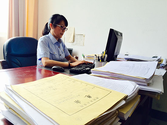 扎着马尾辫,戴着黑框眼镜,一身标准的法官服,笑起来眼睛眯成了一条线,别在胸前的法徽格外引人注意。办公桌上,一台电脑,七摞案卷。办公室里,一张书桌,两把椅子,一个装着各种法律书籍和案件材料的书柜,墙上挂着醒目的审判员职责要求。