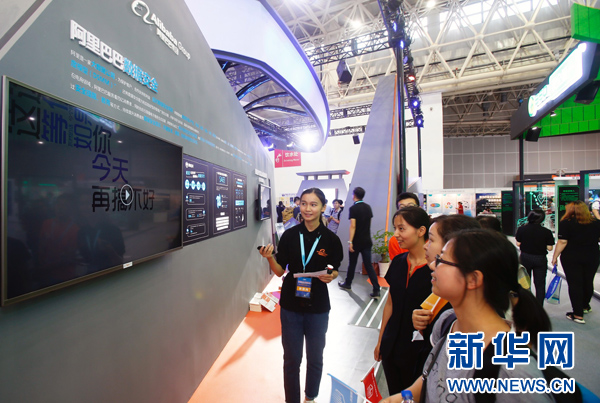 9月19日,2016国家网络安全博览会阿里巴巴展台内,工作人员给观众讲解网络安全知识。