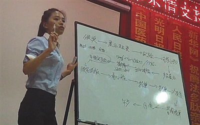 8月25日晚,六渡某酒店会销培训现场,女督导传授会销话术。