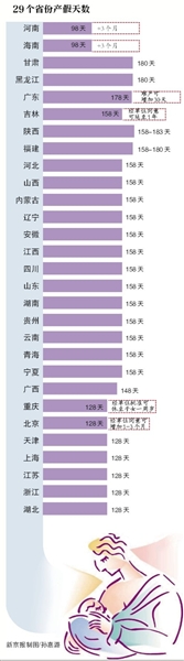 新京报记者梳理发现,“98天+60天”的模式在各省份产假天数中占主流,吉林、河北、四川等14个省份的产假均为158天。此外,陕西产假也是158天,但参加孕前检查的可增加10天产假,剖宫产的增加15天,因此陕西女职工最长可休假183天。同样的,福建产假天数为158天,最多能休180天。