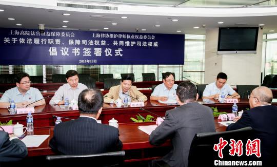 上海市高级人民法院与上海市律师协会10日上午共同签订《关于依法履行职责、保障司法权益、共同维护司法权威的倡议书》。 上海高级人民法院供图