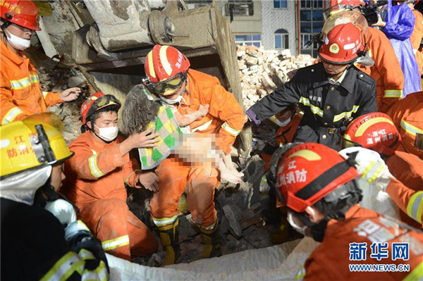 救援人员在现场救出一名小女孩。/新华社