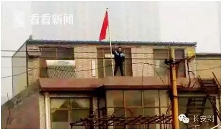 (网上流传的贾敬龙家被拆时照片,贾敬龙举着红旗站在楼上)