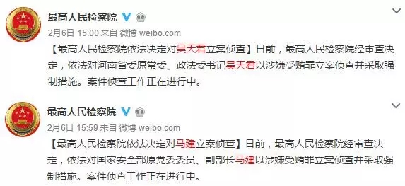 2月6日,最高检分别发布消息称,依法对河南省委原常委、政法委书记吴天君以涉嫌受贿罪立案侦查并采取强制措施;依法对国家安全部原党委委员、副部长马建以涉嫌受贿罪立案侦查并采取强制措施。