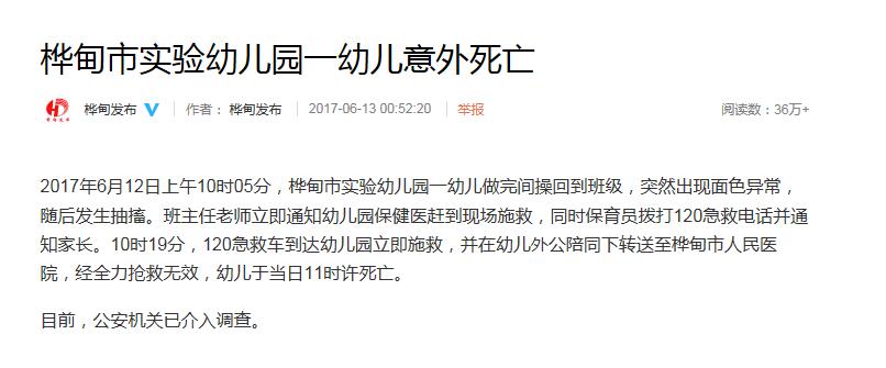 人民网北京6月14日电 据吉林省桦甸市互联网信息中心官方微博通报,6月12日上午10时05分,桦甸市实验幼儿园一幼儿做完间操回到班级,突然出现面色异常,随后发生抽搐。班主任老师立即通知幼儿园保健医赶到现场施救,同时保育员拨打120急救电话并通知家长。10时19分,120急救车到达幼儿园立即施救,并在幼儿外公陪同下转送至桦甸市人民医院,经全力抢救无效,幼儿于当日11时许死亡。