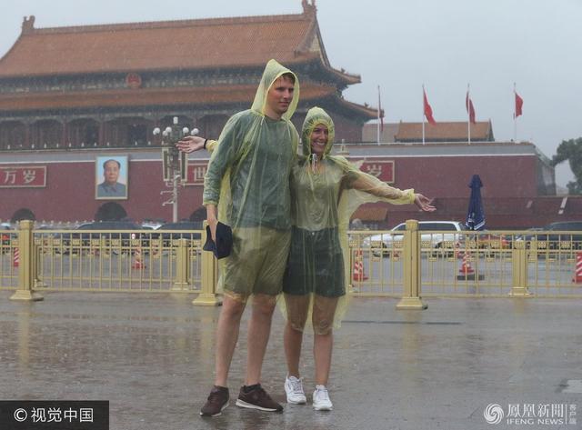 2017年8月18日,北京,游客冒雨游览天安门广场。当天北京遭遇暴雨天气,北京气象台拉响暴雨蓝色预警信号,提醒市民外出做好防范措施。供图:虎虎生风/视觉中国