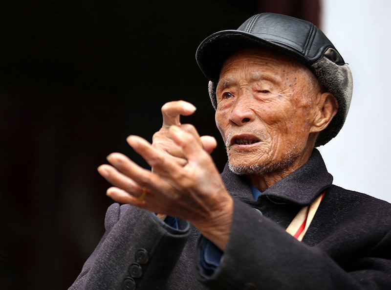 在赣县南塘镇石院村,我们见到了102岁的钟祖鉊。苏区时期,村里16位钟氏同宗兄弟结伴参加红军,13位成为烈士并绝户,最后回来了3位,至今仍健在的只有钟祖鉊。