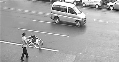 老人骑电动车行至马路中间,突然从车上倒下,头部向下重重摔在地上,顿时血流一地。之后的40秒内,双车道上3辆摩托车、7辆汽车驶过。