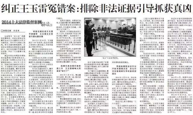 2014年2月,河北省顺平县北朝阳村村民王伟被人用钝器击打致死,在证据明显不充分的情况下,当地公安机关将报案人王玉雷刑事拘留。但在审查逮捕阶段,顺平县检察院依法排除了非法证据,并引导公安机关抓获真凶王斌。王玉雷被无罪释放。“王玉雷案”的公正办理,让公众真切感受到了来自检察机关侦查监督部门的正义之光。
