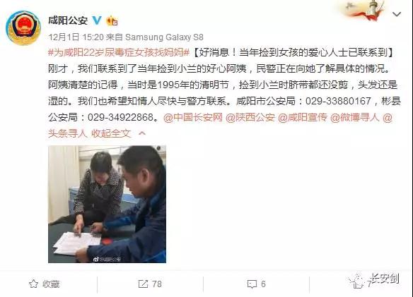 12月1日15:20,@咸阳公安发布实时微博:【好消息!当年捡到女孩的爱心人士已联系到】刚才,我们联系到了当年捡到小兰的好心阿姨,民警正在向她了解具体的情况。阿姨清楚的记得,当时是1995年的清明节,捡到小兰时脐带都还没剪,头发还是湿的。我们也希望知情人尽快与警方联系。咸阳市公安局:029-33880167,彬县公安局:029-34922868。