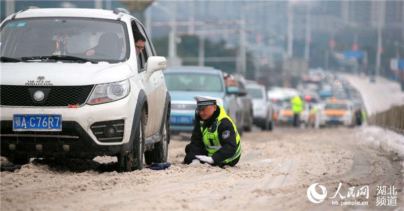 原标题:感动!武汉交警“跪地哥”冰雪中推出百辆被困车辆