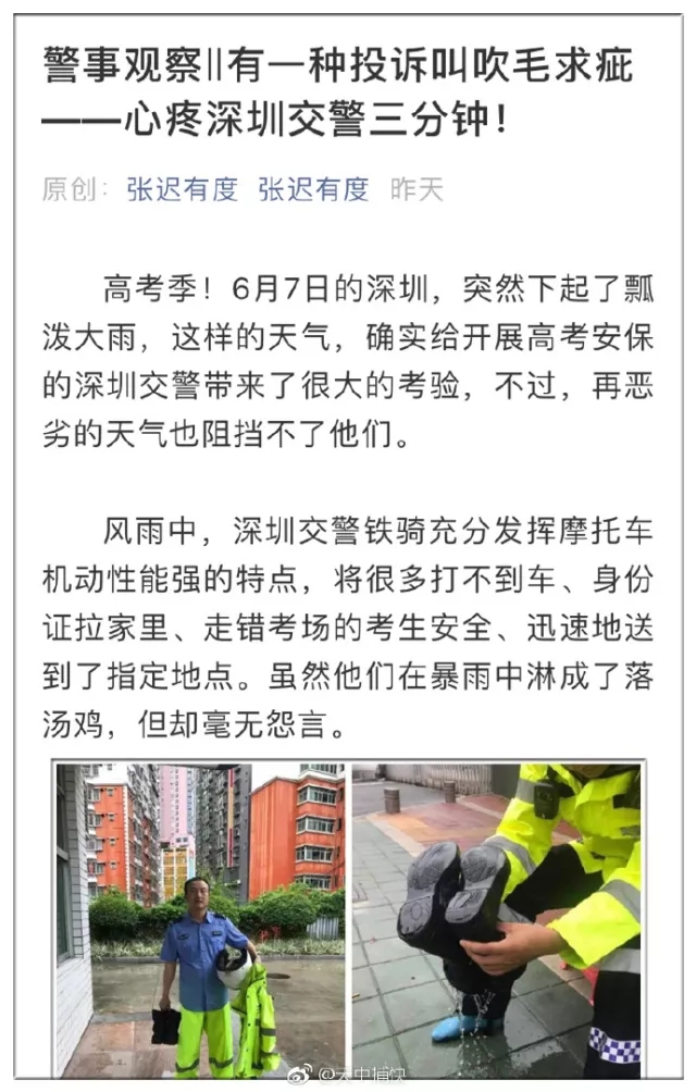根据@天中捕快微博显示,该消息来自“张迟有度”自媒体公号的一篇文章,题为“警事观察||有一种投诉叫吹毛求疵——心疼深圳交警三分钟”。