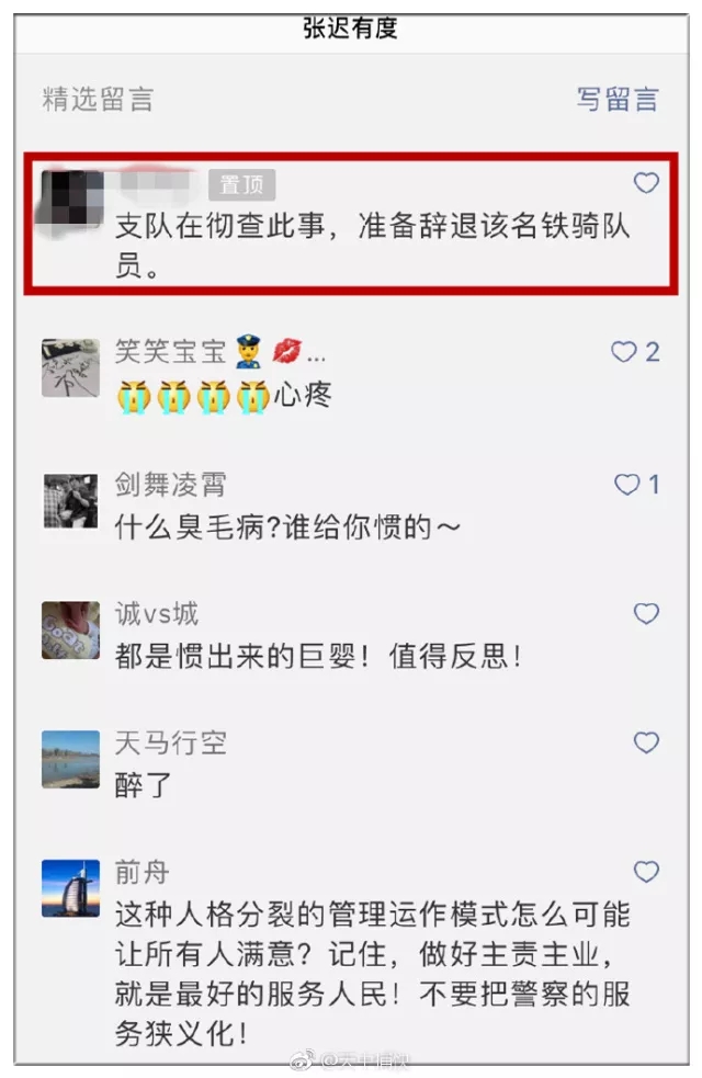 根据@天中捕快微博图片显示,在这篇自媒体号文章的留言区,有网友称,“支队正在彻查此事,准备撤退该名铁骑队员”。