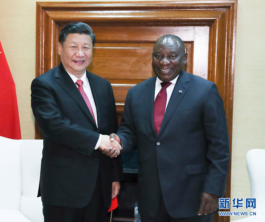 习近平赞赏拉马福萨为推动中南建交和促进两国关系发展作出的重要贡献。习近平指出,中国和南非都是具有重要影响的发展中大国和新兴市场国家。建交20年来,双方致力于合作共赢、共同发展,始终风雨同舟、休戚与共,建立起真诚友好、相互信任、亲密无间的“同志加兄弟”关系。中南关系实现了从伙伴关系到战略伙伴关系再到全面战略伙伴关系的重大跨越,给两国人民带来了实实在在的利益。中方愿同南方一道,以两国建交20周年为契机,相互支持办好今年金砖国家领导人约翰内斯堡会晤和中非合作论坛北京峰会,承前启后,继往开来,推动中南全面战略伙伴关系结出更多硕果,更好造福两国人民。