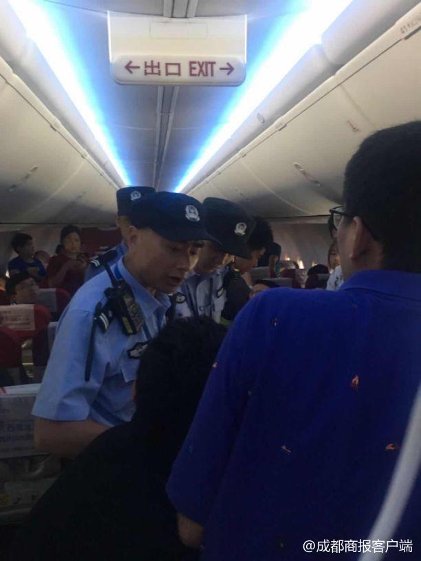 上午6点多,一位身穿蓝色上衣的男子打开了应急门,“他不是坐在应急门边,是在后面,上去把门打开的。”贾先生说,随后,安保人员控制了现场,直到8点多,警察将打开应急门的男子带走,其他乘客才得以下飞机。据贾先生说,部分着急的乘客已经办理退票离开,其他乘客正被安排至酒店休息。