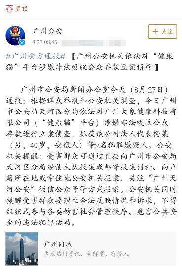 新华社广州8月27日电(记者詹奕嘉)广州市公安局新闻办公室27日通报称,根据群众举报和公安机关调查,广州市公安局天河区分局对广州大象健康科技有限公司(“健康猫”平台运营方)涉嫌非法吸收公众存款进行立案侦查,该公司法人代表杨某等9名犯罪嫌疑人已被抓获。