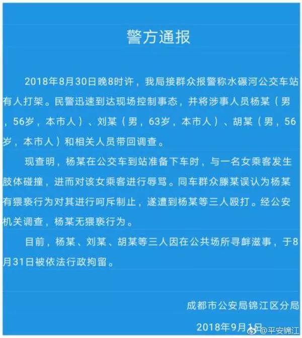 9月1日下午6时40分,成都市公安局锦江区分局通过其官方微博@平安锦江 对此事发布通报。经公安机关调查,杨某无猥亵行为。