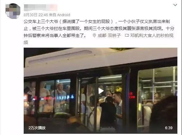 封面新闻9月1日消息,8月30日,一段拍摄于成都街头的视频在网上流传,发布者称,“3名老人在公交车上触摸一名女子臀部,同车小伙出言喝止,被3人打成重伤。”随着视频不断被转发,在网络上引起了广泛关注。