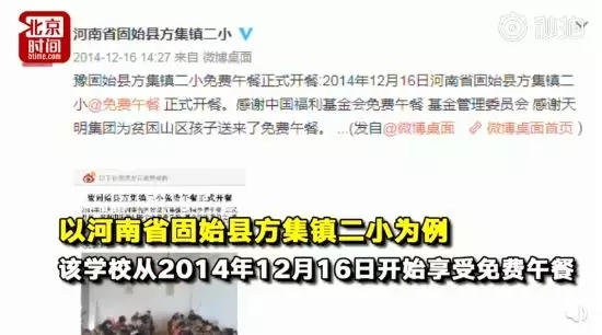 3、免费午餐学校每日更新学生伙食情况 全国800所受资助学校均开有微博 14日,河南商水大曹小学营养餐问题曝光后,网友发现多所受免费午餐资助的学校每天都会发微博公示学生餐食。@免费午餐称,目前享受资助的800多所学校,均有微博且会每天公示学生午餐。网友:总有人在默默无闻的真心做事。(@时间视频)